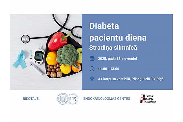 Lai atzīmētu Pasaules Diabēta dienu, Paula Stradiņa Klīniskās universitātes slimnīcas (Stradiņa slimnīca) Endokrinoloģijas centrs un Latvijas Diabēta asociācija 13. novembrī aicina uz pasākumu, kas veltīts diabēta aprūpei. Pasākumā paredzētas izglītojošas lekcijas, sarunas ar speciālistiem, pacientu pieredzes stāsti, kā arī iespēja bez maksas noteikt glikozes līmeni asinīs un izmērīt asinsspiedienu. Aicināts ikviens interesents, pasākums norisināsies A1 korpusa vestibilā no plkst. 11.00 līdz 13.00.