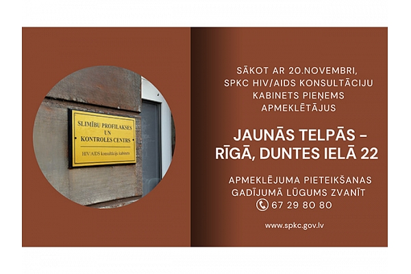 Slimību profilakses un kontroles centrs (SPKC) informē, ka, sākot ar 20. novembri, SPKC HIV/AIDS konsultāciju kabinets pieņems apmeklētājus jaunās telpās – Duntes ielā 22, Rīgā (iepriekšējā adrese: Klijānu iela 7) nodrošinot ērtāku piekļuvi.